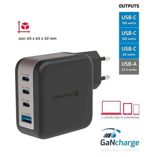 Swissten GaN Travel Charger 100W 3X USB-C PD + USB-A