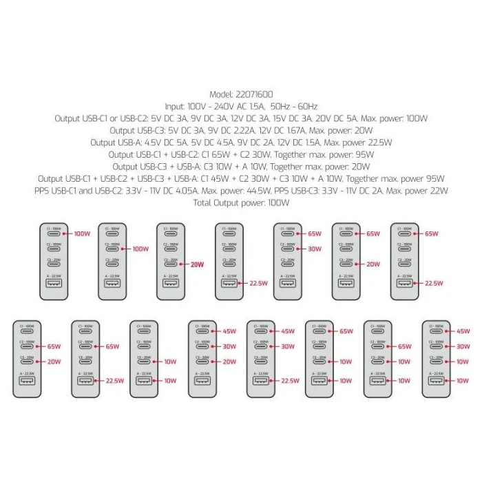 - USB-C1 / C2: 5V–20V / макс. 100W
