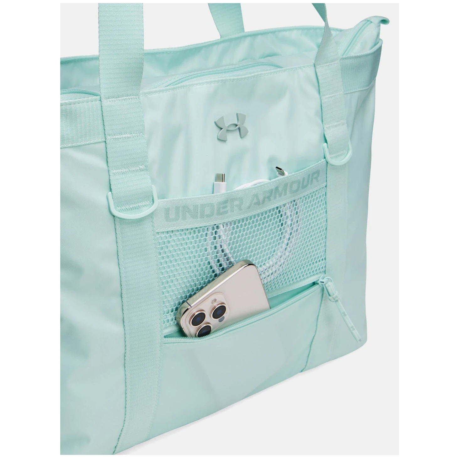 Дамска чанта Studio Tote от Under Armour с голямо основно отделение, затварящо се с цип, с вътрешна организация и отделение за лаптоп или таблет с мека подплата – побира до 16" MacBook Pro® или лаптоп.Прикрепващи точки с D-халки за лесно закрепване на всяка чанта с карабинер. Цип, оборудван с ластик, който може да се използва например в косата.