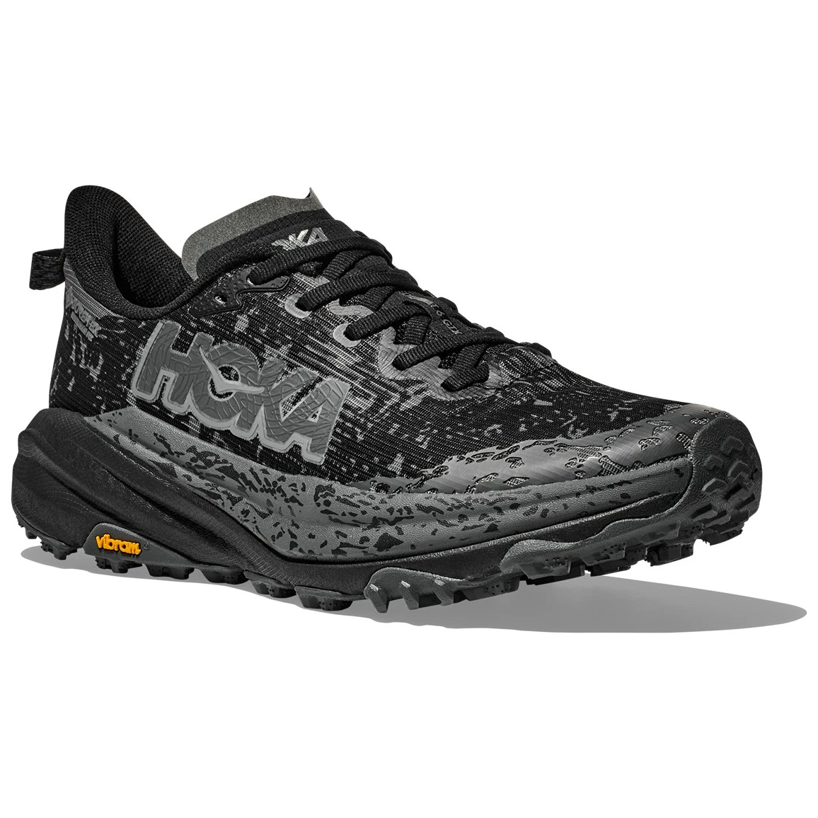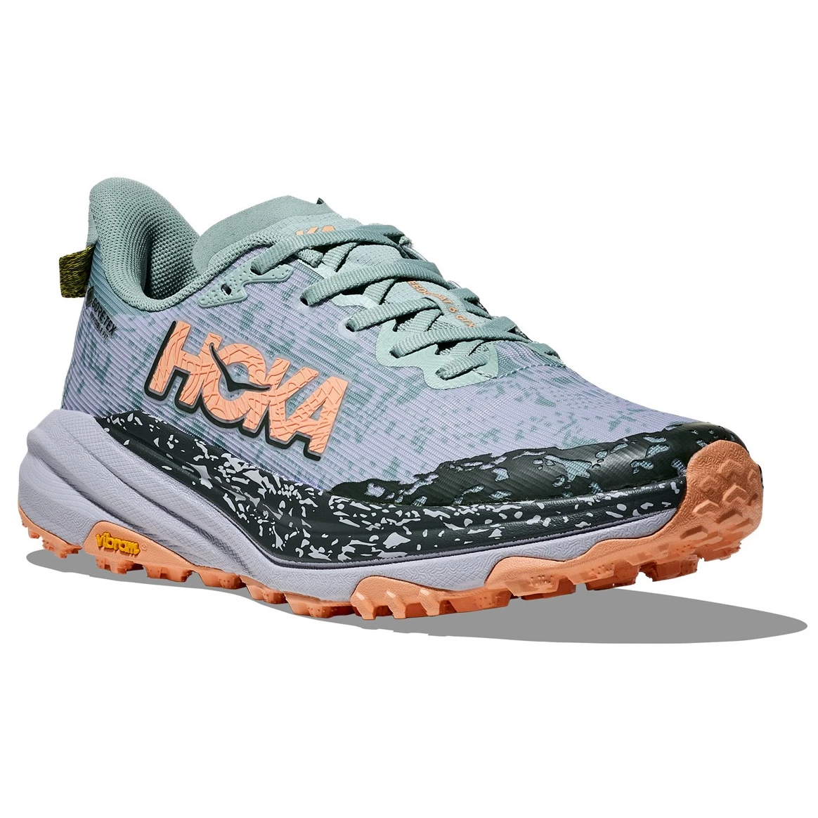 Обувките за бягане Speedgoat 6 GTX на Hoka са предназначени за технични пътеки. 6. поколението се завръща с ниско тегло и отлично сцепление. Тази обувка продължава от подметката до връзките с междинна подметка Vibram® Megagrip и Traction Lug за по-добро сцепление с рохкав терен. Speedgoat 6 запазва същата височина на подметката и рокерска форма (извивка на подметката), използва по-лека смес на междинната подметка и по-дебела двуслойна жакардова мрежа, която вдъхва увереност на всеки терен.