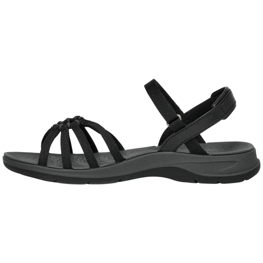 Сандалите имат мека микрофибърна подплата, която осигурява комфорт при стъпване. Еластичната предна част, специално проектирана за дамското стъпало, създава елегантен ефект на мъниста. Заедно с регулируемата лента на свода и найлоновата лента в задната част, тя перфектно фиксира свода на стъпалото. Благодарение на гумираната подметка, сандалите имат страхотно сцепление, така че няма да ви разочароват на никакъв терен.