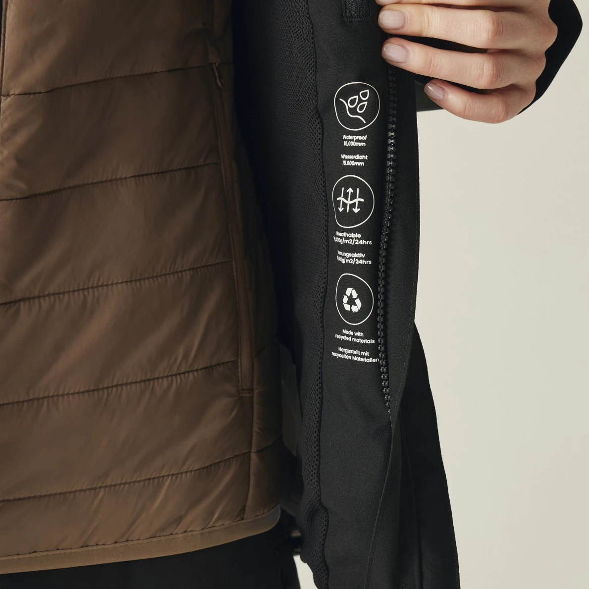 Изработено е от лек полиамид. Вътре се крие високо затопляща изолация от рециклиран материал Thermoguard. На яката, маншетите и долния подгъв има еластична обшивка. Ще стоплите ръцете си в два странични джоба с цип.