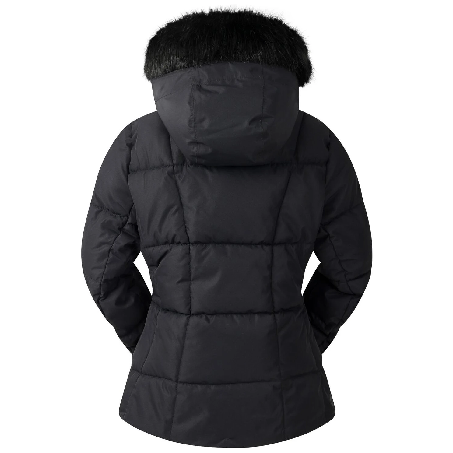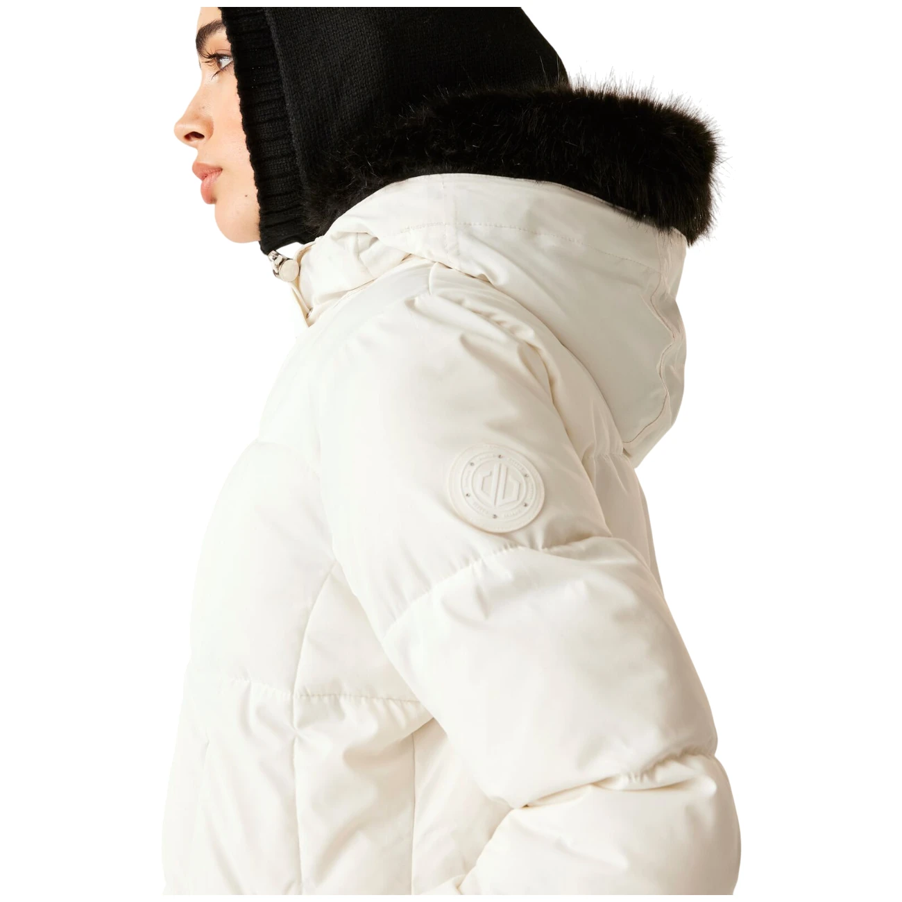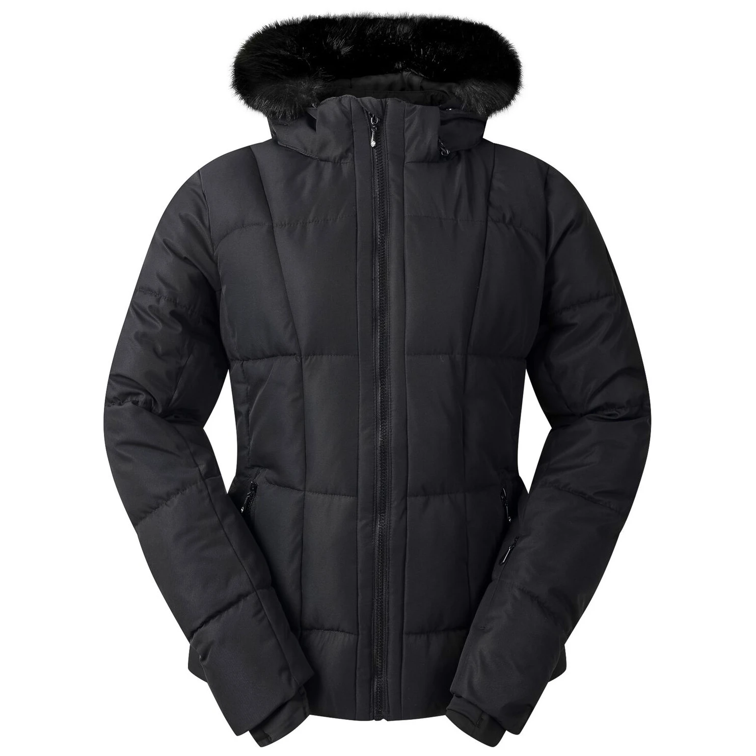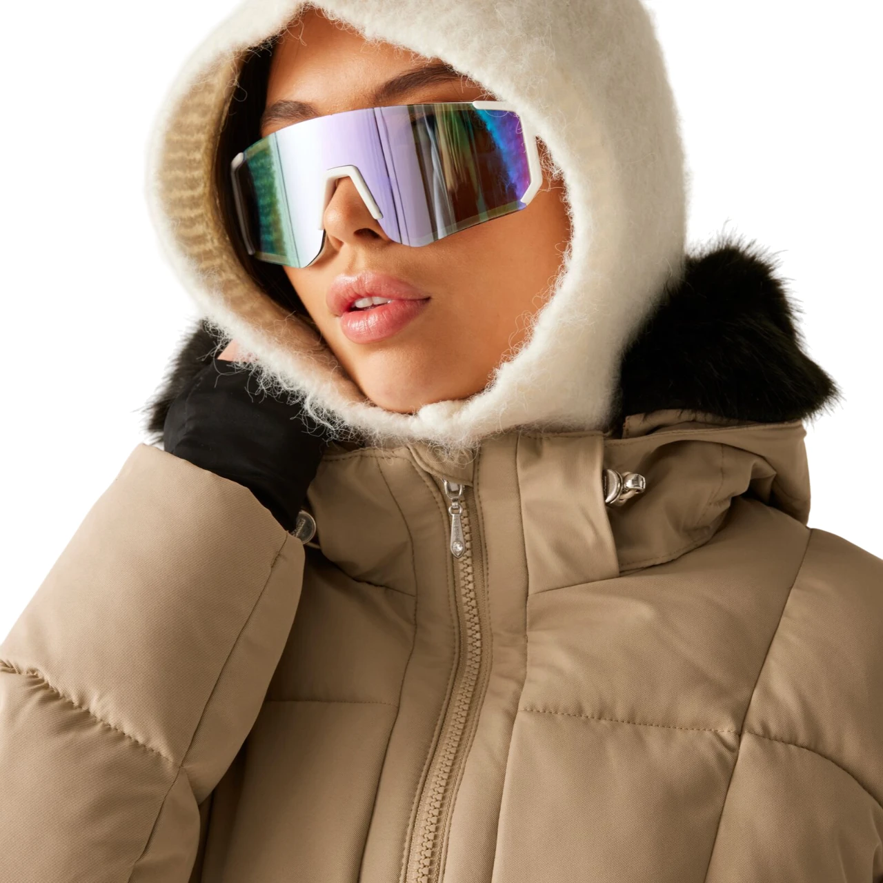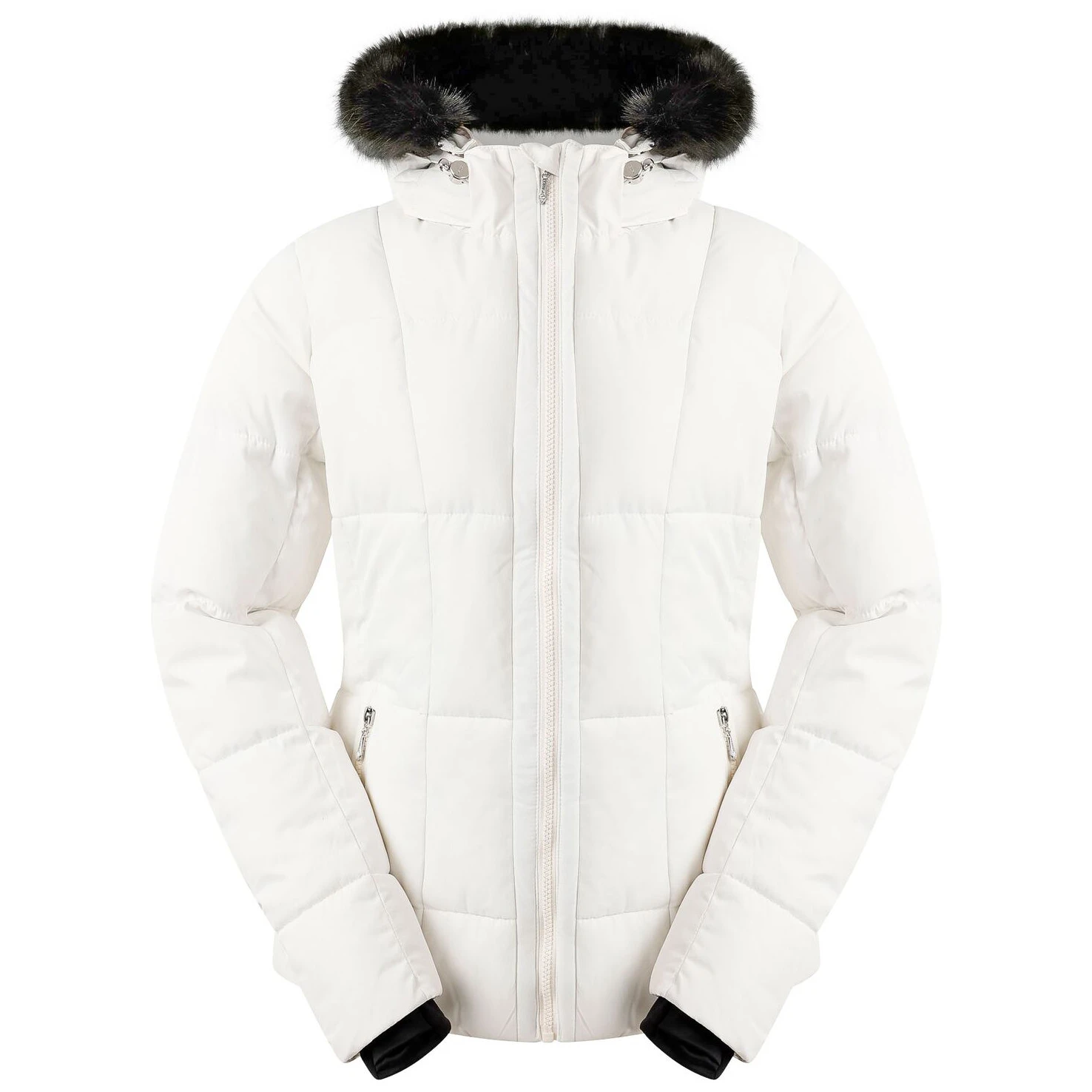 Стилът на якето е подчертан от кристали Swarovski на ципа и декорациите. Практичните елементи включват подвижна качулка с подплата от изкуствен косъм, фиксиран снежен колан, вътрешен джоб за ски карта и два долни джоба с цип. Топлите вътрешни маншети на ръкавите и регулируемите подгъви добавят комфорт и защита от вятър и сняг.