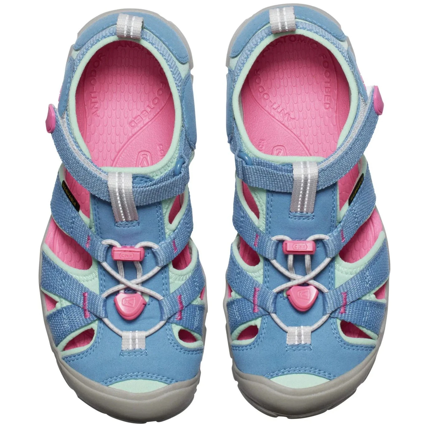 Детските сандали Seacamp II CNX от марката Keen са изработени по технологията Keen.Cnx и се отличават с лекота и водоустойчивост. Благодарение на бързото закопчаване с велкро те държат крака здраво на мястото му и предотвратяват неприятни наранявания. Стелката и подплатата са обработени антибактериално, за да поддържат здравословна среда в обувката. И тези обувки разполагат с патентованата защита на пръстите на Keen.