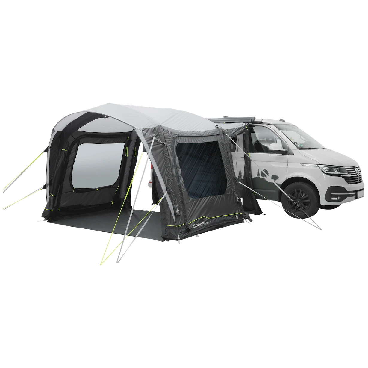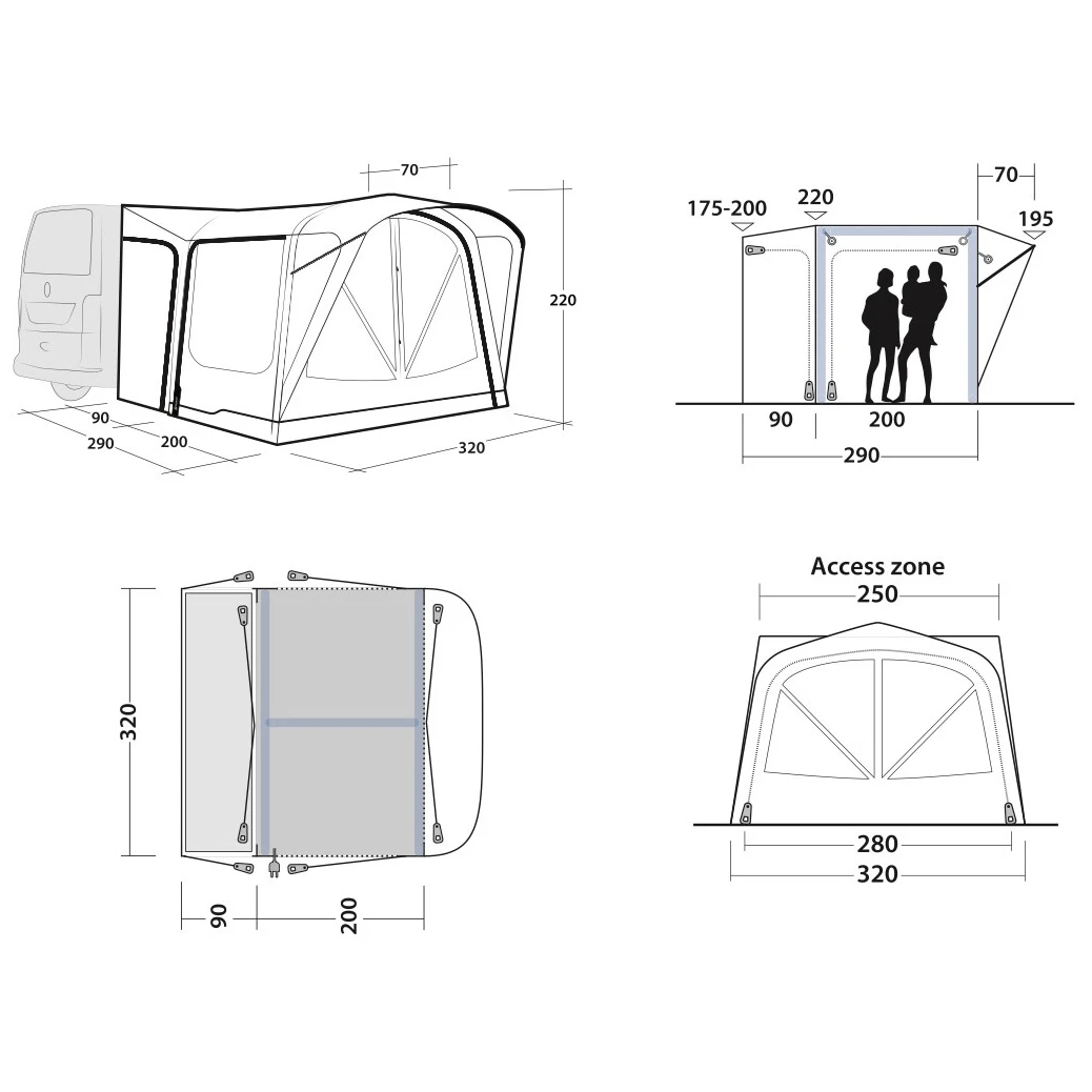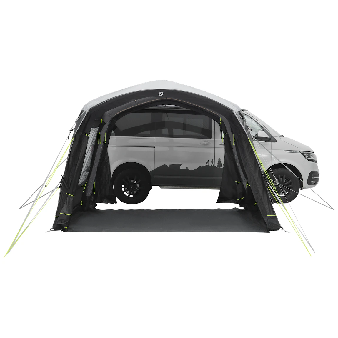 Към палатката води основният голям безбариерен вход с мрежа против комари. Може да се разкопчае напълно настрани, така че да не пречи, или да се отвори само отгоре за допълнителна вентилация. Още два странични входа един срещу друг позволяват пълно отваряне на палатката. Големите затъмнени прозорци осигуряват много светлина, но също така защита от UV лъчите и неприкосновеност на личния живот. Могат да се затворят със завеси и да затъмнят пространството за по-добър сън.