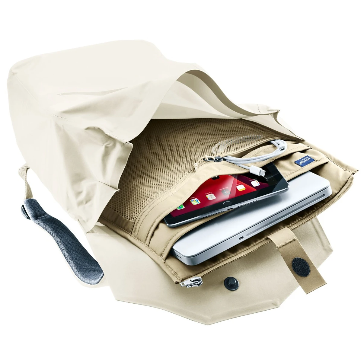 Основното отделение, покрито с капак, съдържа подвижен органайзер, който предлага отделение за документи, отделение за лаптоп и джоб с цип. Отстрани има два еластични джоба за бутилка с напитка. Отпред има водоустойчив джоб с цип за мобилния ви телефон.