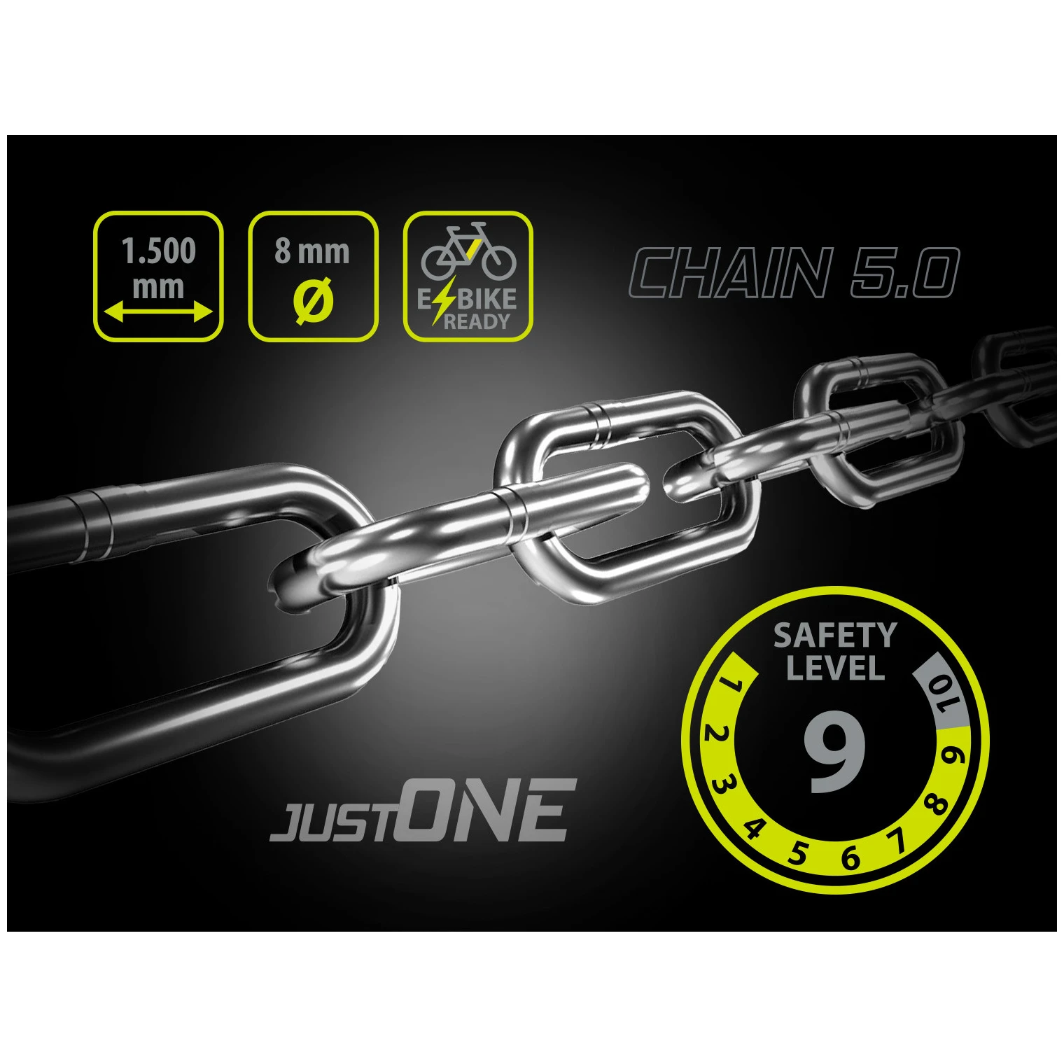 Надеждна защита за вашия велосипед – верижната ключалка Just One е здрава и сигурна ключалка, предназначена за ежедневна употреба и в града, където рискът от кражба е по-висок. Ключалката е с дължина 1500 mm и е съставена от звена с диаметър 8 mm от закалена стомана, което осигурява висока устойчивост на срязване или насилствено отваряне. Благодарение на това, тя достига степен на защита 9, което осигурява спокойствие и увереност при осигуряване на вашия велосипед.