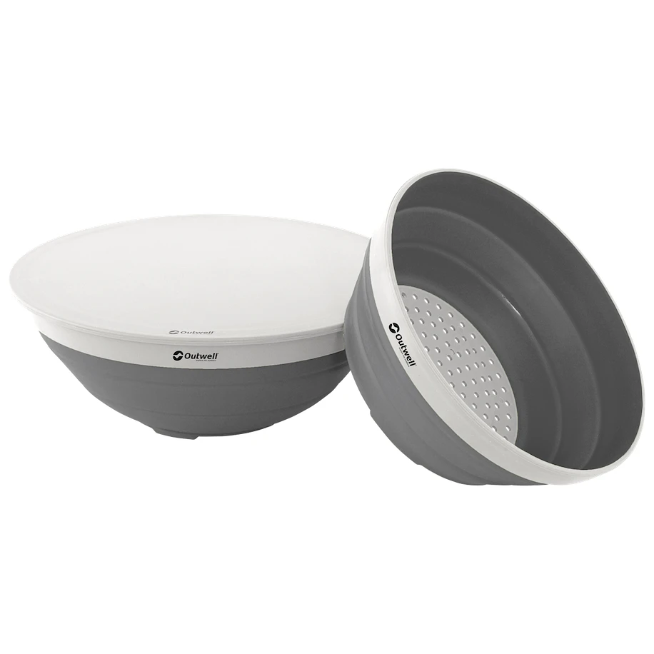 Комплектът Collaps Bowl & Coander Set от датската марка Outwell е чудесен комплект за хранене и закуски, който не заема почти никакво място.