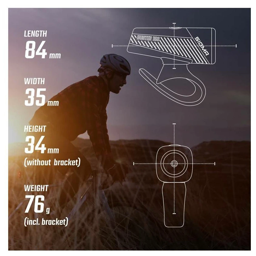 Комплектът светлини Sigma Buster 150 + Nyte 10 комбинира силна предна светлина с мощност 150 лумена и обхват до 74 метра с лека и издръжлива задна светлина, видима на 500 метра. Предната Buster 150 предлага 5 режима на светене, памет за последната настройка и до 25 часа светене. В режим High светлината Buster 150 достига светлинен поток от 150 лумена за до 3 часа, в режим Mid свети до 7,5 часа при светлинен поток от 75 лумена. А ако случайно пътуването се проточи, в режим Low ще свети надеждно до 14,5 часа.