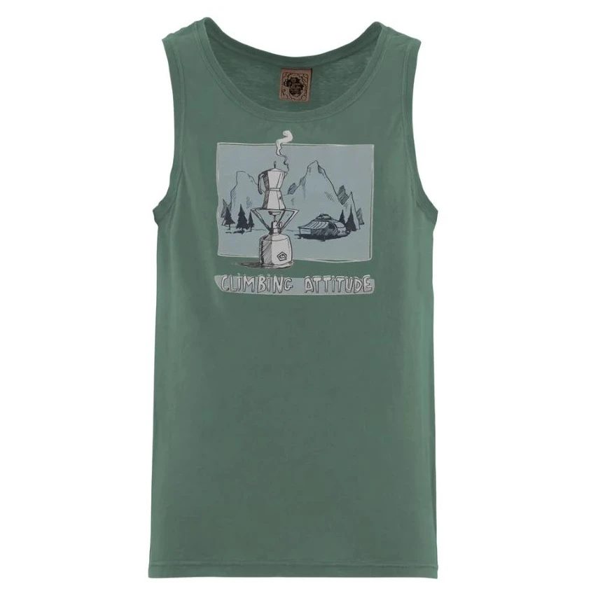 Модерен мъжки потник 1Caffe Men's от марката E9 е изработен от 100% органичен памук.Потникът е със стилна щампа на варящо се кафе в мока кафеварка в долина под планините. Произведена е в Италия с минимално замърсяване на околната среда и с акцент върху екстравагантната изработка, уникален дизайн и комфорт при катерене.