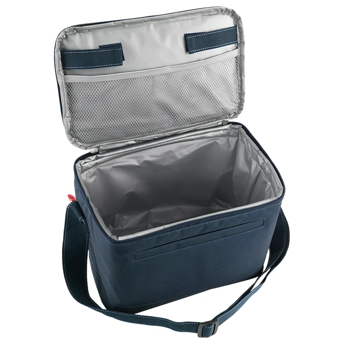 Изработен е от висококачествен полиестерен материал, а вътрешният материал е PEVA подплата със заварени шевове, която е водоустойчива и лесна за почистване. Големият горен капак може да се отваря от трите страни, което ви осигурява идеален достъп до вътрешността. С обем от 10 литра в основното отделение и допълнително място в предния джоб, можете да приготвите пикник за вашето семейство или приятели. Вътре във капака има мрежест джоб за лед. Тя има регулируема каишка, която ви позволява да носите чантата в ръка и на рамо. Когато не ви е необходима, чантата може да бъде сгъната в компактен пакет благодарение на компресионните ленти.