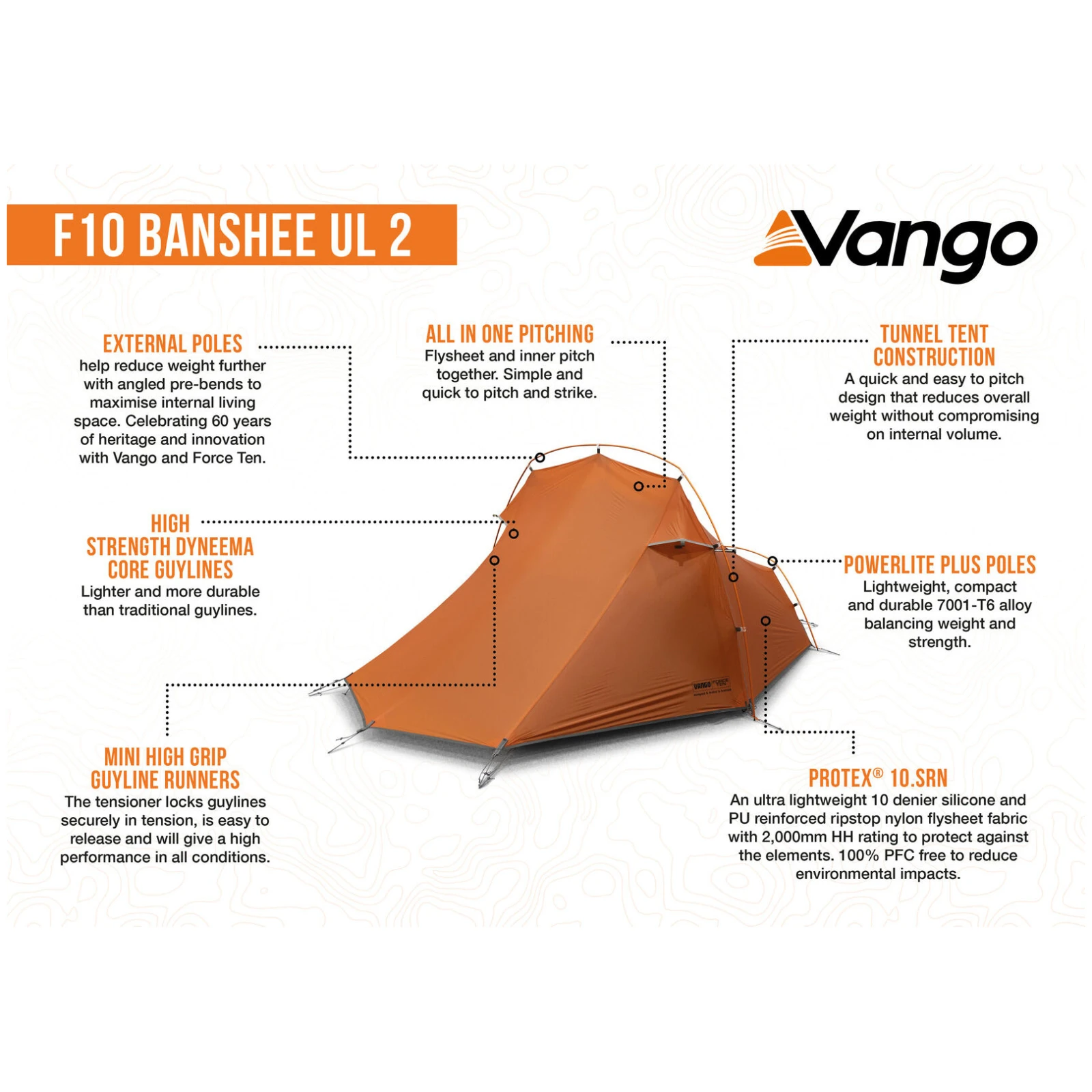 Force Ten Banshee UL2 палатката е модерно преосмисляне на легендарния модел Banshee, който в продължение на десетилетия защитава авантюристи в планини, долини и по крайбрежието. Тунелната конструкция позволява бързо и лесно издигане на палатката, като същевременно намалява общото тегло без компромис за вътрешното пространство. Благодарение на системата „всичко в едно“, вътрешната палатка остава прикрепена към външната, което значително ускорява процеса на разпъване и прибиране. Палатката може да се издигне и без вътрешната част като минималистичен заслон.