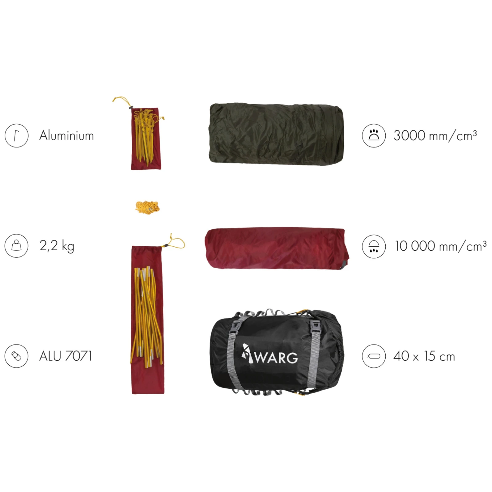 сглобява се за 5 минути, опакова се за 3 минути, лека, удобна за съхранение, идеална за многодневни туризъм (GR, AltaVia...), дори раница от 60 л+ се побира през страничните входове, ширината на вътрешната палатка е идеална в сравнение с други палатки Warg за двама, класическа конструкция с 2 пръта