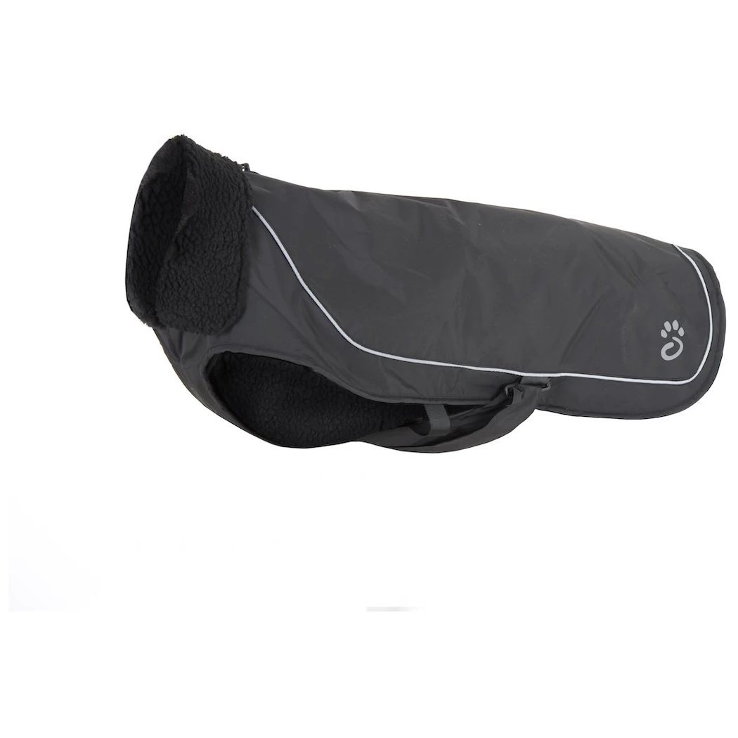 Външният найлонов материал Cordura® е силно устойчив на износване и разкъсване. Отвътре има топла поларна подплата, приятна на допир. Благодарение на удобната кройка, якето добре покрива гърдите и предпазва врата. Закопчаването с велкро е допълнено с ленти около задните крака, които предотвратяват повдигането на якето при вятър или движение. Светлоотразителните елементи подобряват видимостта при намалени условия. Зад яка има отвор с цип за закачане на повод към нагръдника.