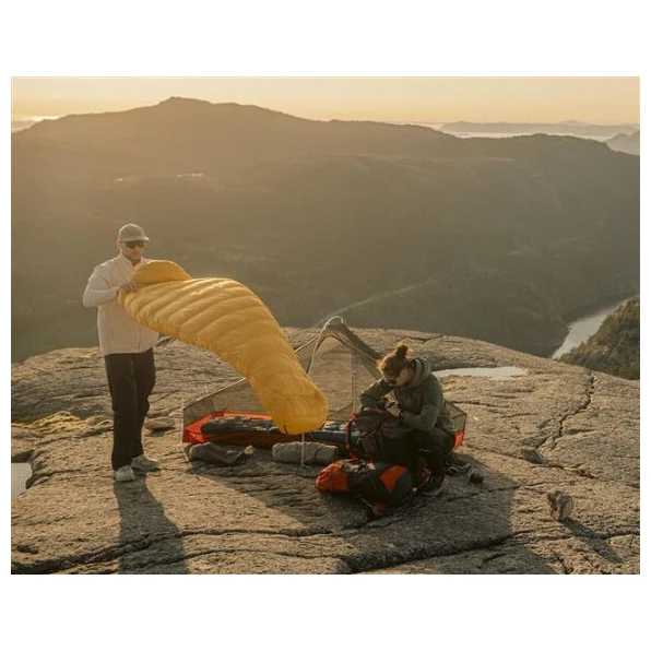 Пълнена е с патешки пух с пълнеж от 700 кубика и съотношение на пуха 95/5, което изолира отлично. За това спомага новооформената термояка, която плътно обгръща раменете и предотвратява загубата на топлина. Качулката е с връзки от двете страни. Удобната 3D форма на мумия подобрява топлоизолацията и осигурява комфорт. Зоната около стъпалата е специално оформена като перка на акула, което позволява на стъпалата да останат изпънати в естествената си позиция през нощта.