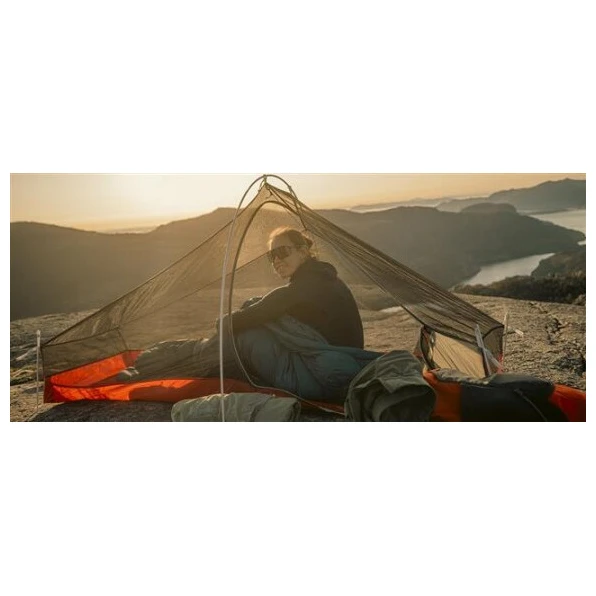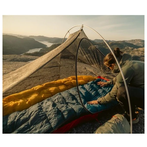 Пълнежът му е от патешки пух с обем 600 кубика и съотношение 85/15, което изолира отлично. За това спомага новооформената термояка, която плътно обгръща раменете и предотвратява загубата на топлина. Качулката има връзки за пристягане от двете страни и яка, предпазваща лицето. Удобната 3D форма на мумия подобрява топлоизолацията и осигурява комфорт. Зоната около стъпалата е специално оформена като перка на акула, което позволява на стъпалата да останат изпънати в естествената си позиция през нощта.