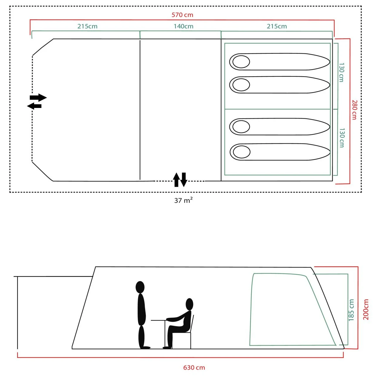 Използва се предимно за семейни палатки, където акцентът е върху пространството и комфорта. Повече спални означава повече уединение и по-голяма вариативност на вътрешното пространство.
