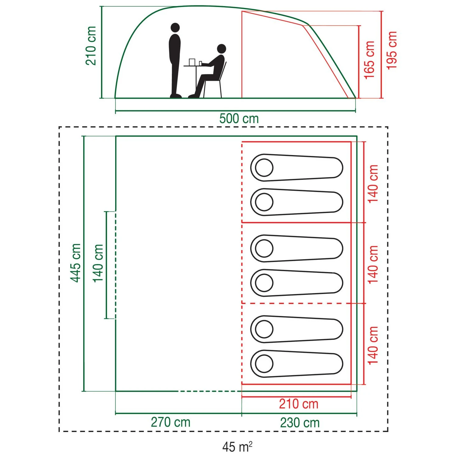 Използва се предимно за семейни палатки, където акцентът е върху пространството и комфорта. Повече спални означава повече уединение и по-голяма вариативност на вътрешното пространство.