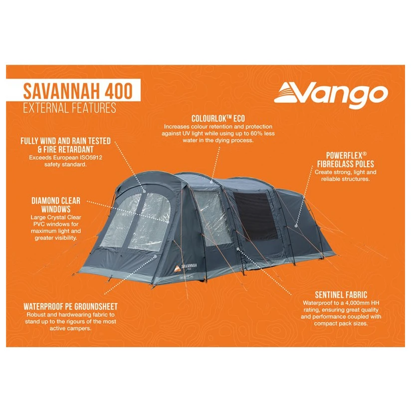 Пакетната палатка Savannah 400 е подходяща за до 4 души и е изработена от леки, но много издръжливи пръти PowerFlex® Fibreglass. Вътре в палатката има две спални, които могат да бъдат разделени с помощта на вътрешната разделителна преграда Toggled - система за закопчаване с куки и примки. Спалните са изработени от тъкан Nightfall, която блокира дневната светлина и създава идеални условия за добър нощен сън. Следва просторна дневна зона от две части, която е подходяща за къмпинг маса или други мебели.