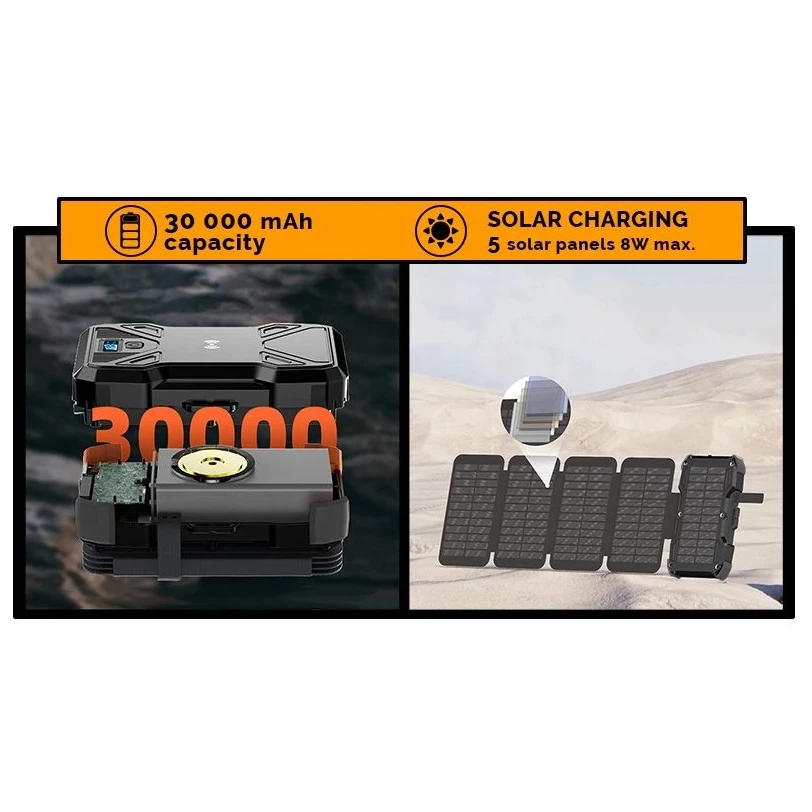 Устойчивата конструкция със сертификат IP54 предпазва устройството от прах и пръски вода, докато подсилената конструкция гарантира устойчивост на удар дори в тежки условия. Powerbank е оборудван с Li-Polymer батерия с дълъг живот и стабилна производителност. Има вграден LED фенер с три режима на светене (включително SOS), LED дисплей с точен индикатор за оставащия капацитет и практична лента за окачване, която улеснява използването на соларно зареждане по време на движение на терен.