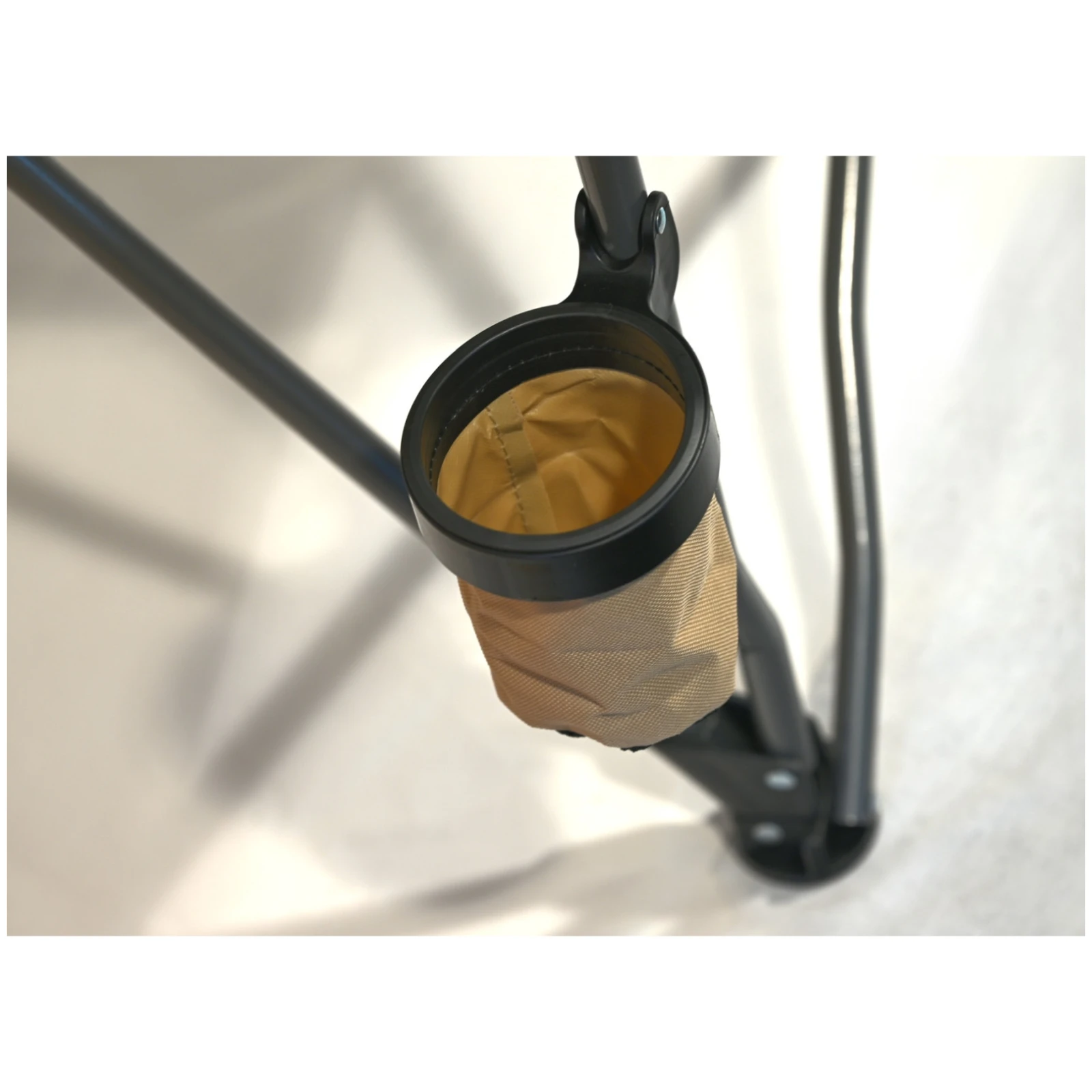 От дясната страна има поставка за напитки с мрежесто дъно, благодарение на която любимата ви напитка винаги ще ви бъде под ръка. Страхотен спътник за риболов, къмпинг, седене край водата и релакс в градината.