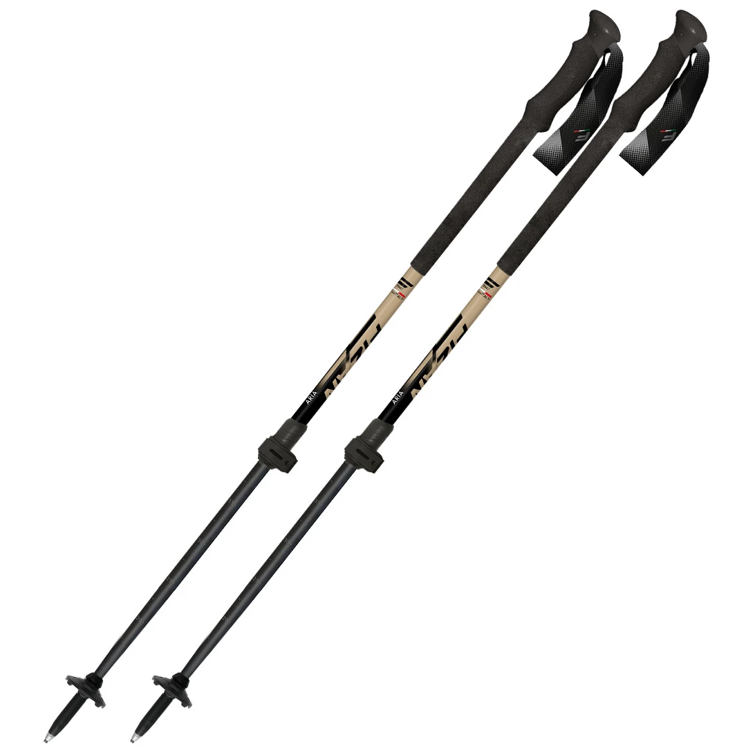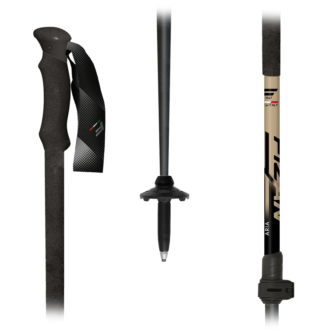 Двукомпонентни телескопични щеки Fizan Aria, подходящи предимно за ски алпинизъм. Щеките са удобни за хващане, а удължената дръжка от пяна е подходяща за траверсиране по стръмни планински склонове.