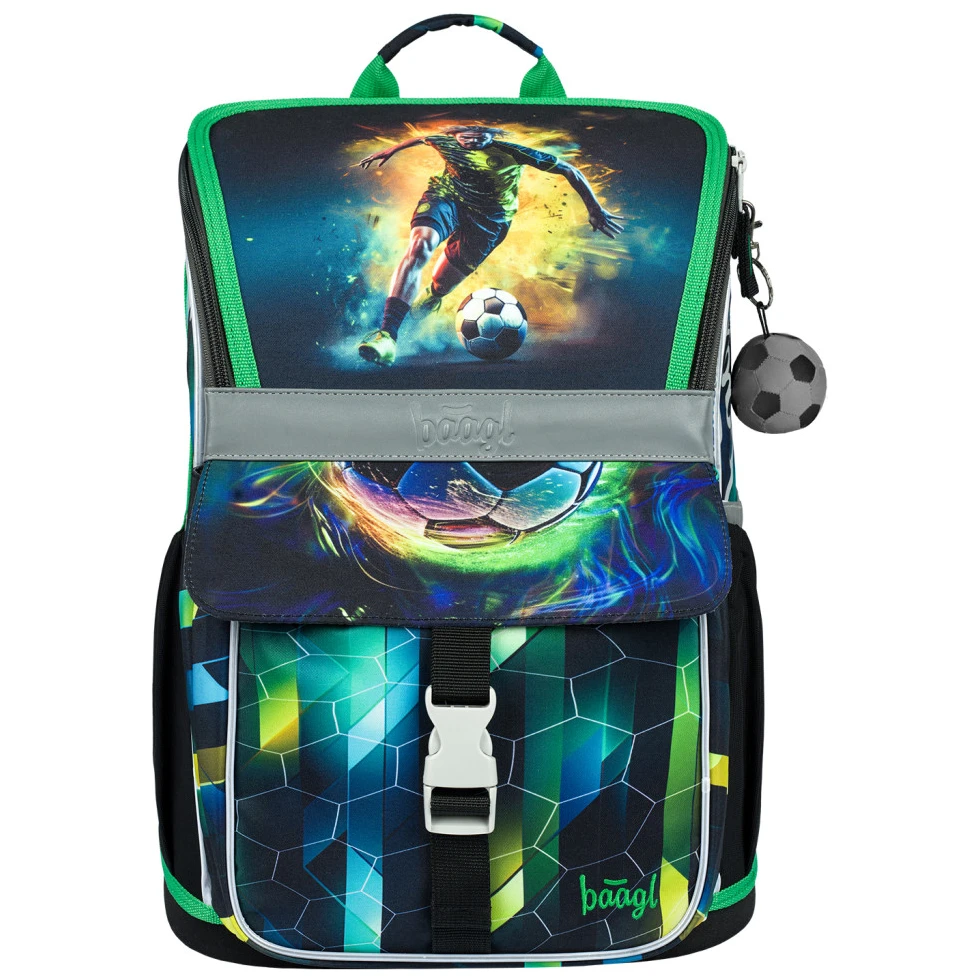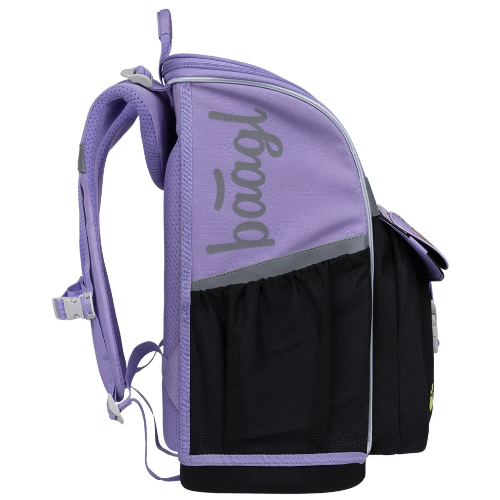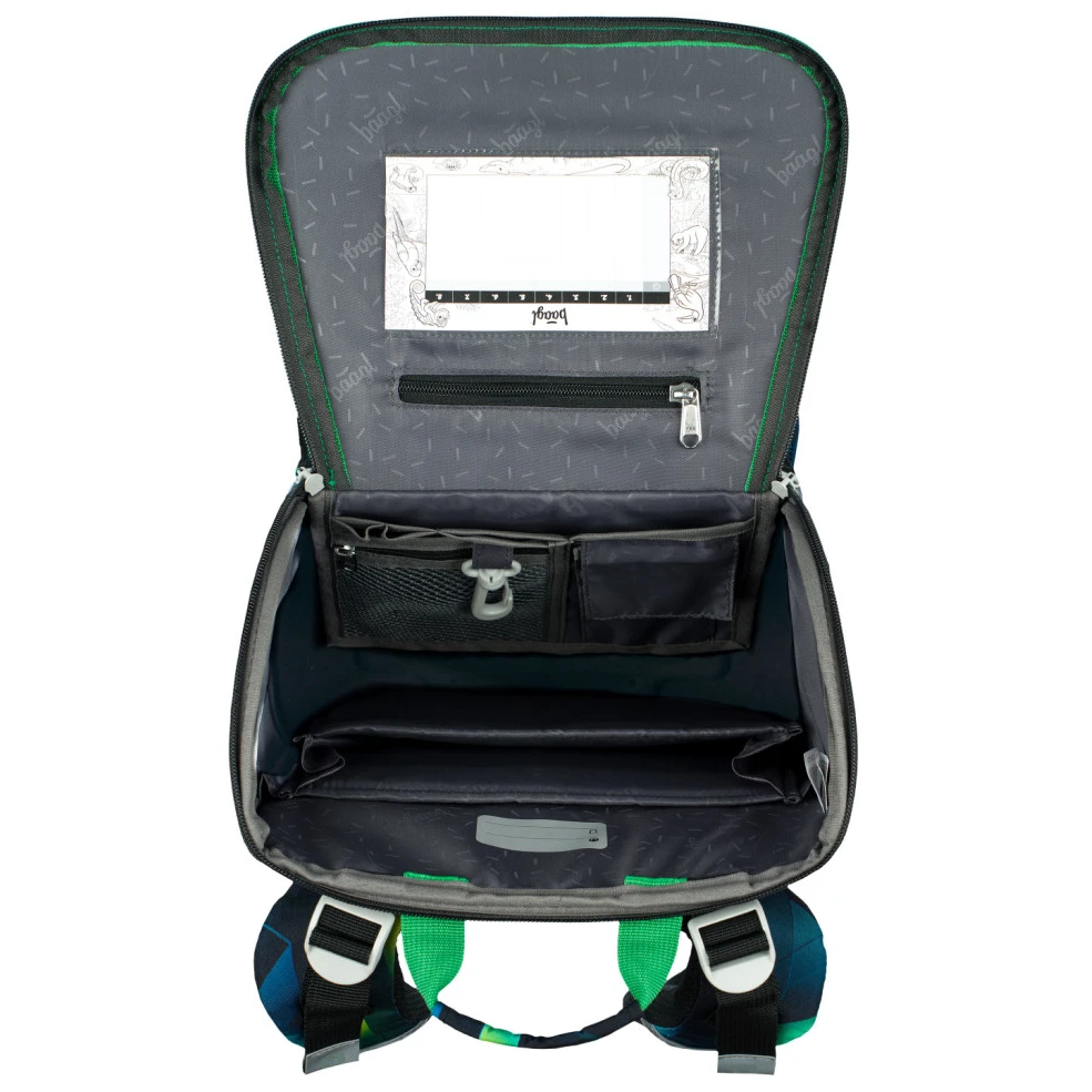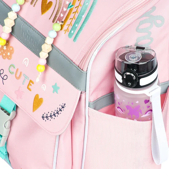 Раницата е изработена от здрав и водоустойчив материал. Подсилената конструкция и здравото дъно поддържат стабилна форма във всяка ситуация. От външната страна има изолиран преден джоб със закопчаване с катарама и два странични джоба с цип, които са идеални за бутилка с напитка. Основното отделение е достъпно чрез отваряща се система, която улеснява достъпа до принадлежностите директно от чина. Закопчава се с цип. Вътре в отделението има органайзер, който помага за по-добро разпределение на теглото на учебниците, и прозрачен джоб за училищното разписание. Светлоотразителните елементи, разположени от всички страни, повишават видимостта на детето при условия на слаба осветеност.