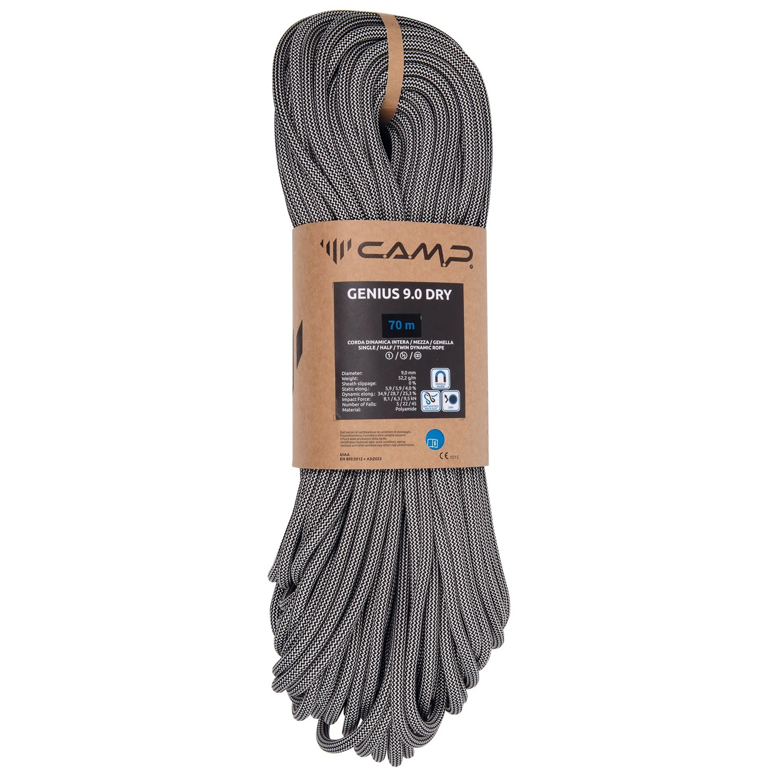 Genius 9.0 Dry - 70m от Camp е едно от най-леките въжета с диаметър 9.0 на пазара. Тройна степен на издръжливост и сухо покритие го правят готов за големи терени. Сухо покритие - помага за отблъскване на влага, мръсотия и камъчета, които могат да повредят въжето с времето при интензивна употреба. Мастилени маркировки обозначават средата на въжето за по-лесно управление и безопасни спускания. Комбинацията от гладко управление и добро динамично удължение прави въжето идеален партньор за многопистово катерене.
