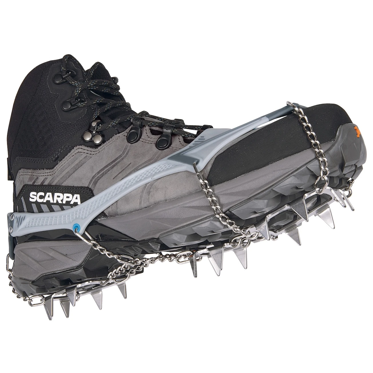 За безопасността се грижат шестнадесет 15 mm стабилни шипове от неръждаема стомана, които са разположени за максимално сцепление и странично захващане. В същото време тази система минимизира количеството метал за намаляване на теглото. Иновативната 3D система за връзване осигурява перфектно прилягане и абсолютна стабилност на обувката. Двойната шарнирна предна част се адаптира добре към обувките и терена. Включен е практичен калъф, който предпазва шиповете и останалата част от вашето оборудване.