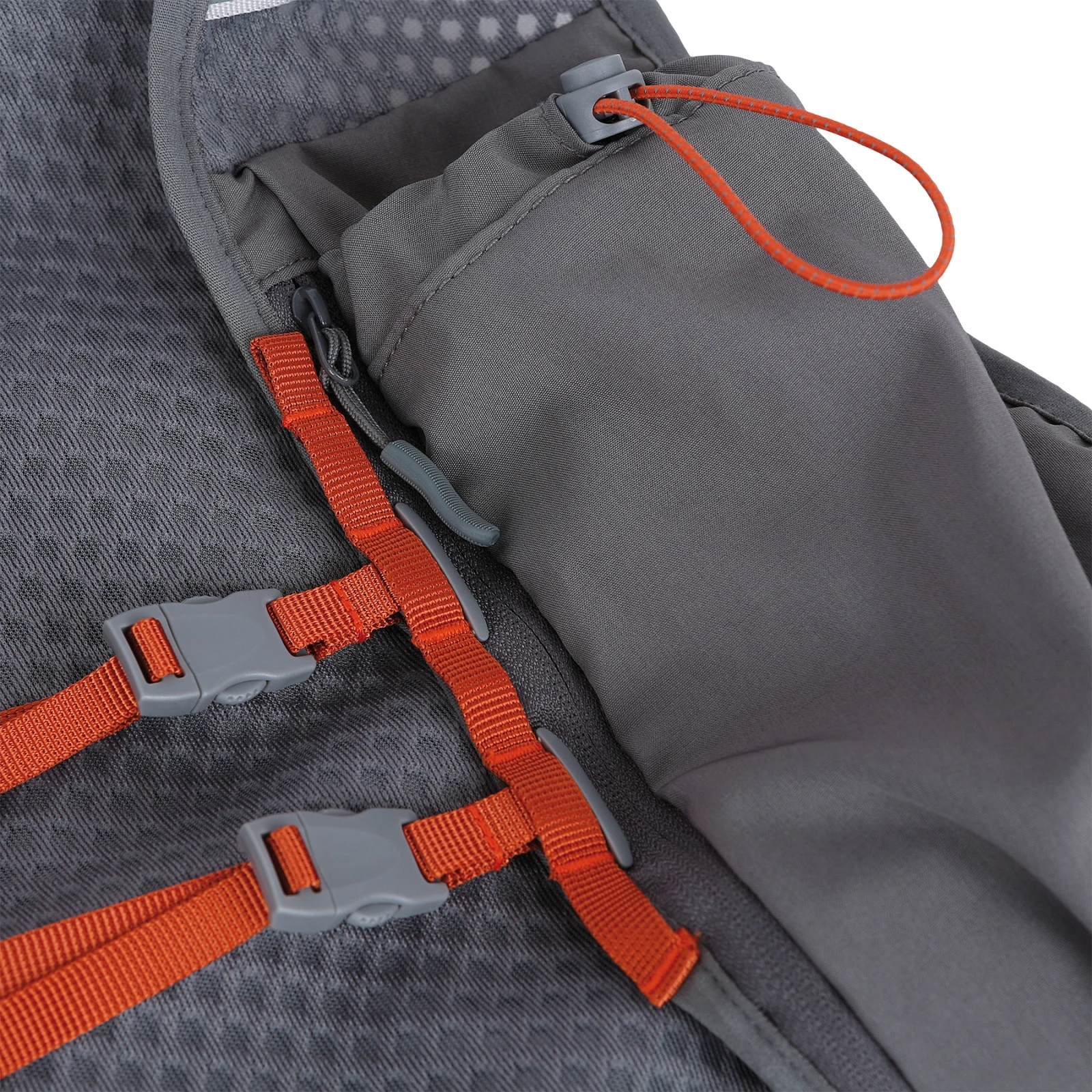 В задната част има два джоба, единият от които е с цип за сигурно съхранение на ценности. Не липсва и място за хидратиращ сак, което позволява удобно допълване на течности по време на бягане. В предната част са разположени две еластични гръдни джоба, идеални например за меки бутилки или енергийни блокчета, така че всичко важно е лесно достъпно без нужда от спиране.